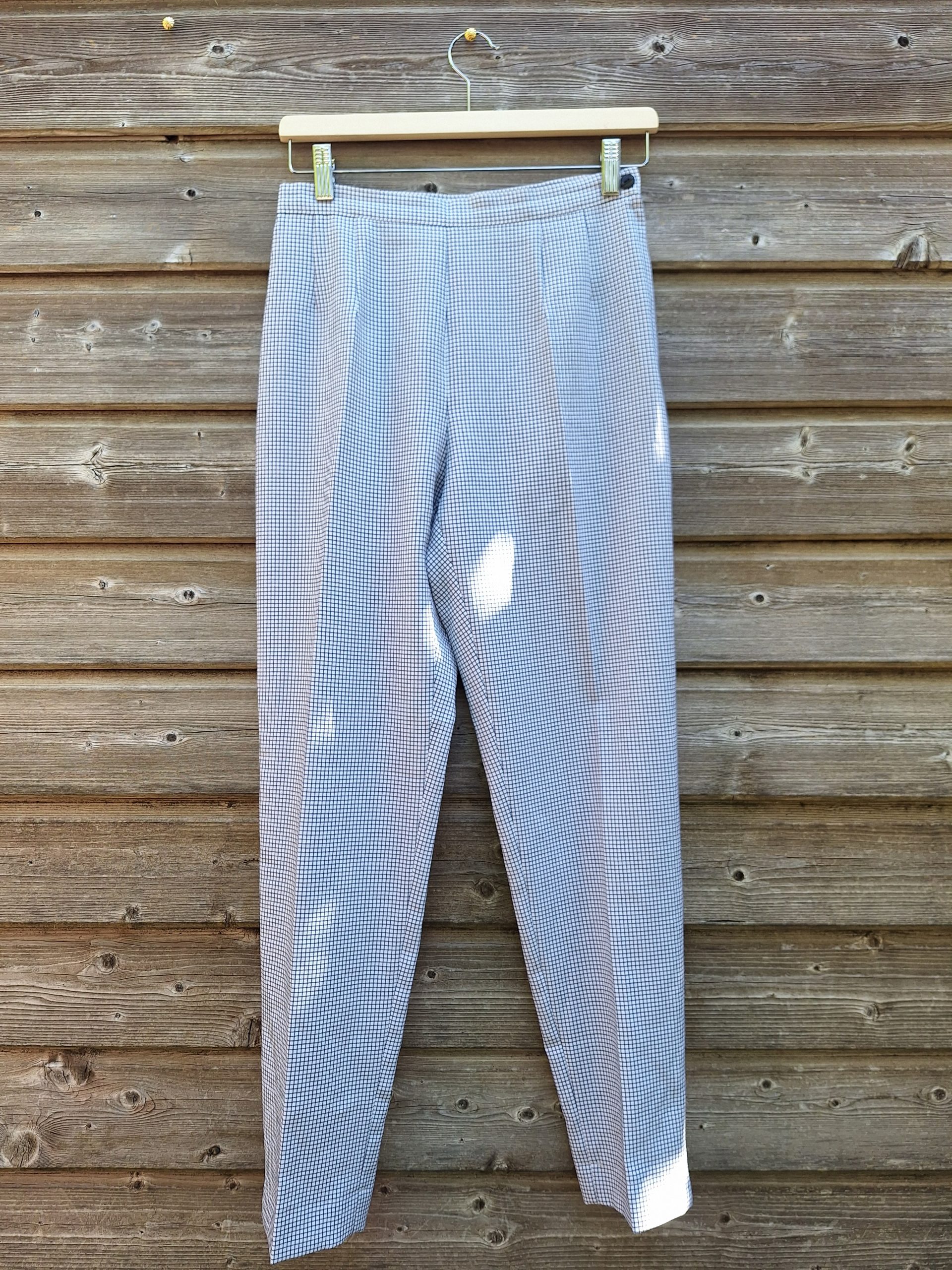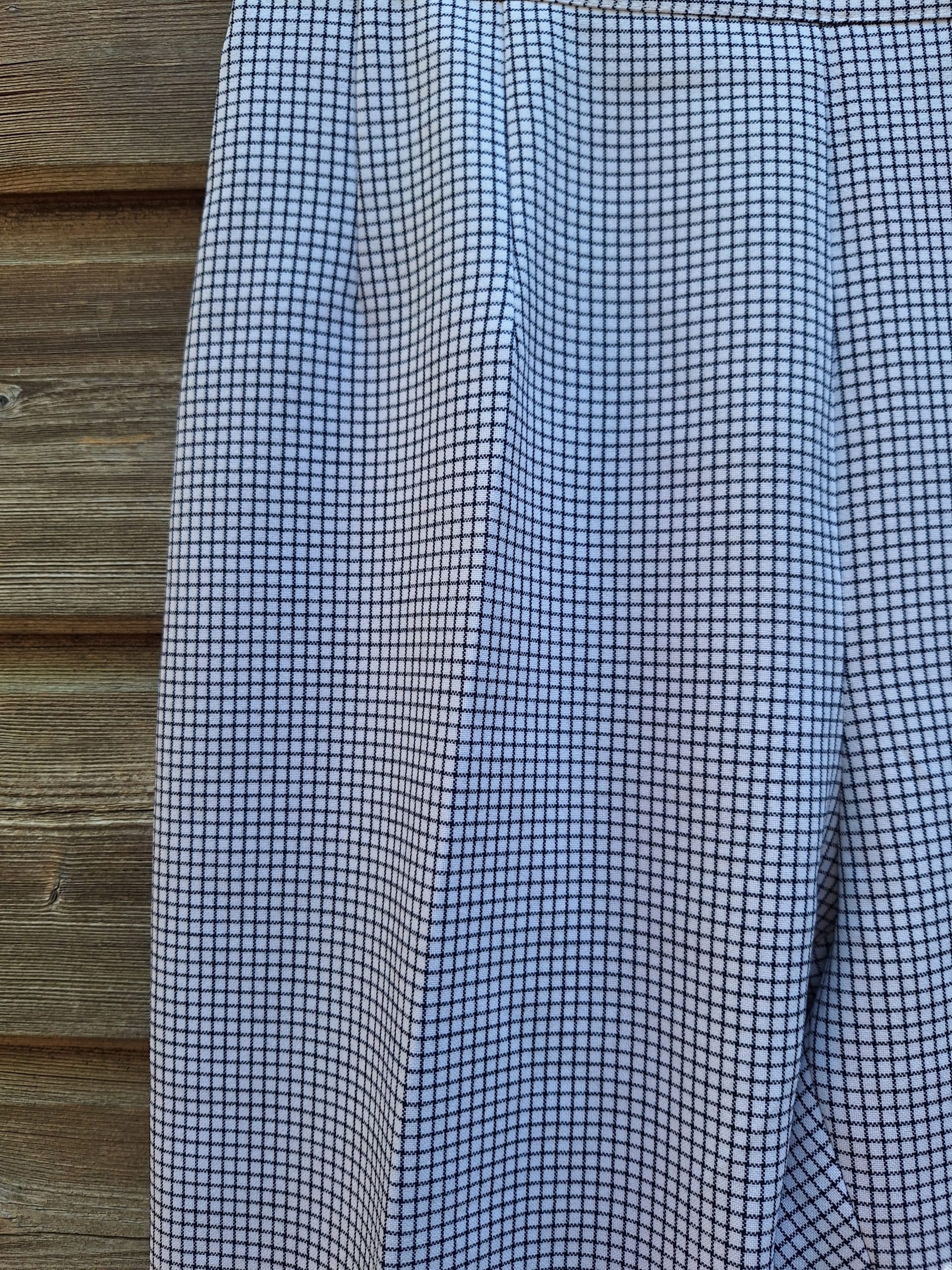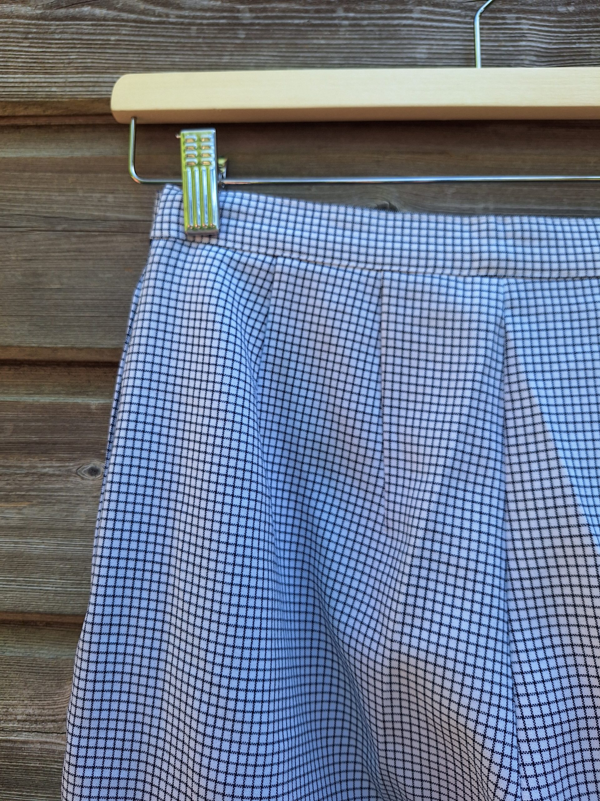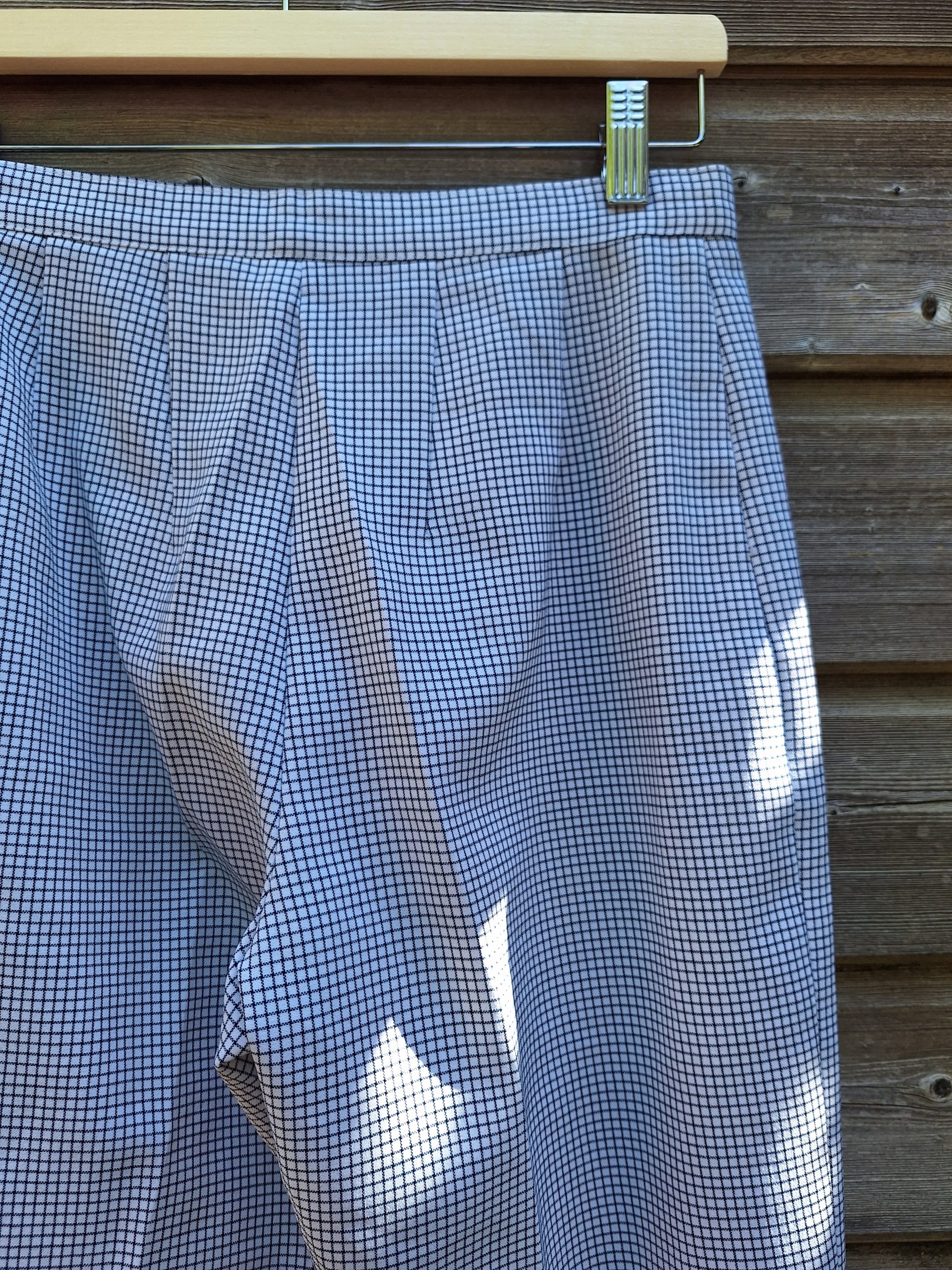 Fermeture et bouton sur le côté, fronces à la ceinture et bas des jambes fendues.