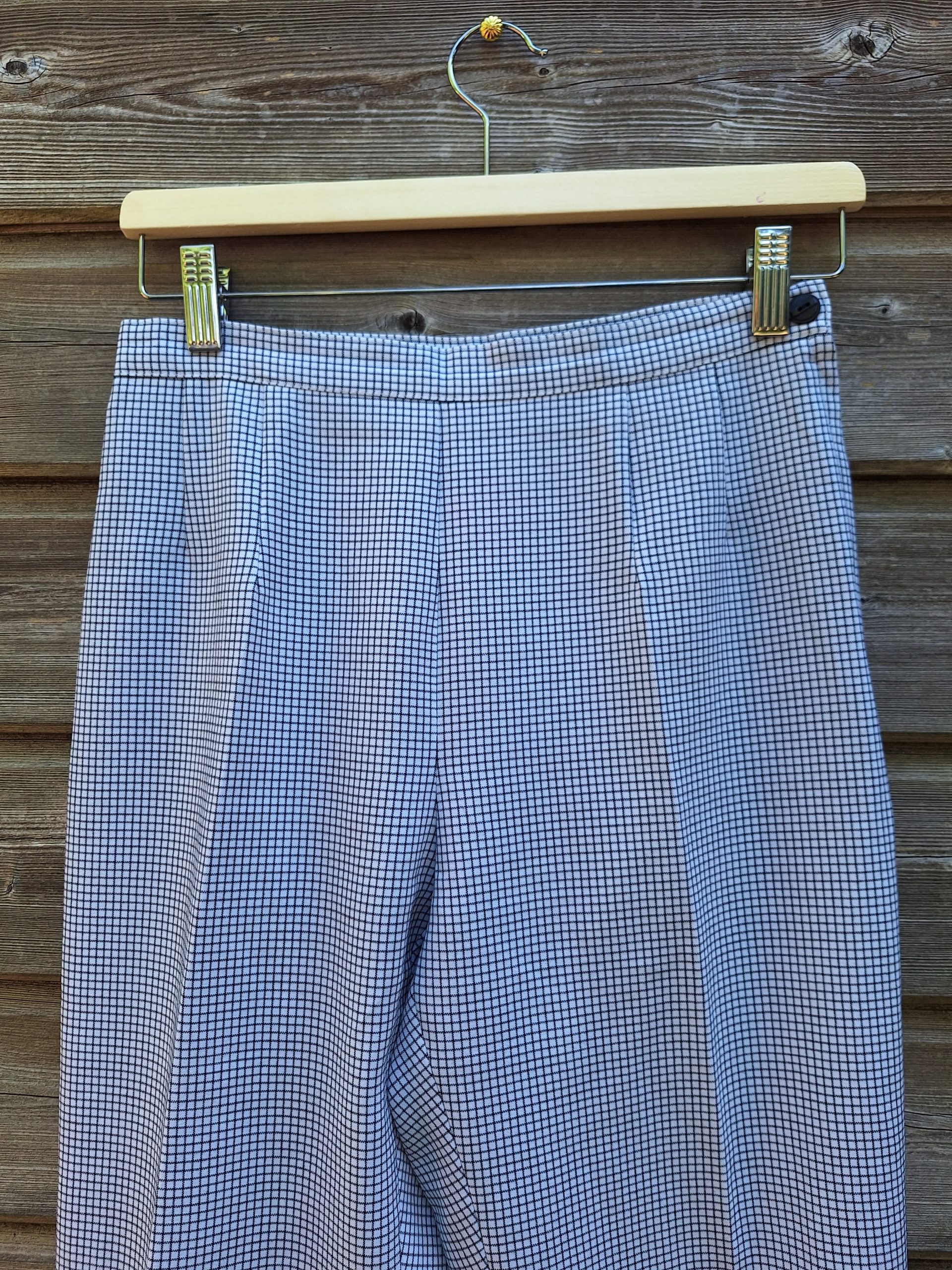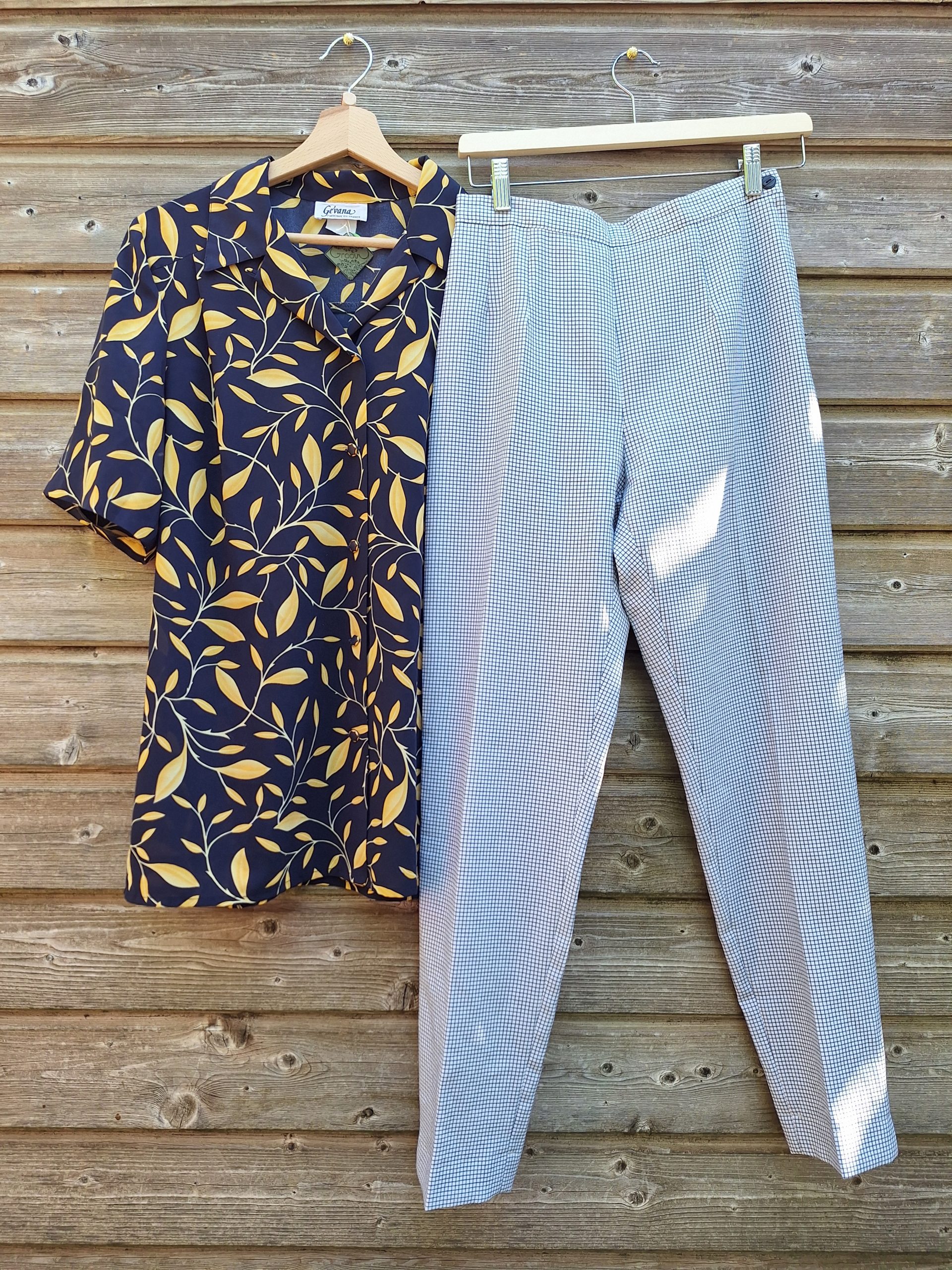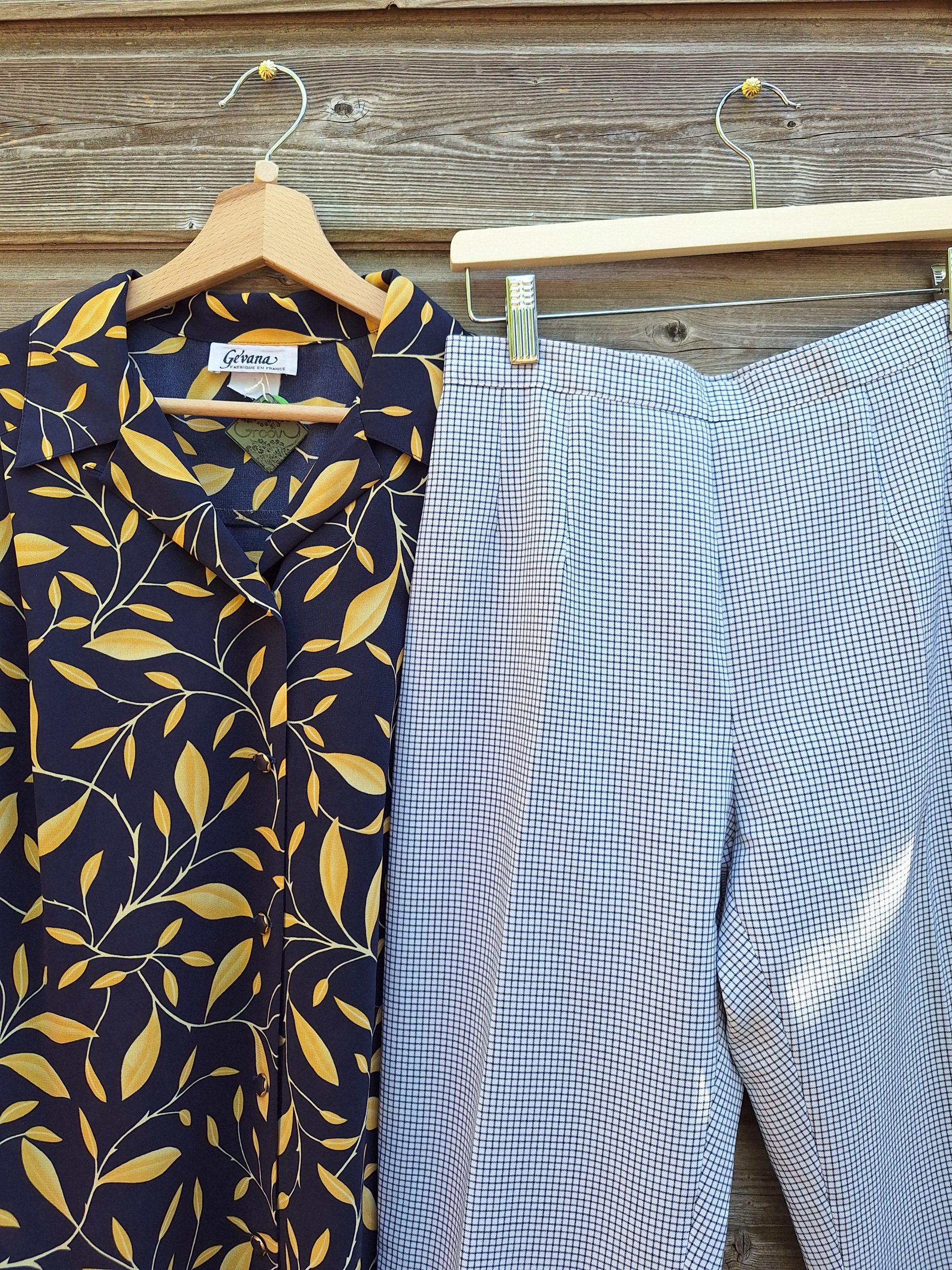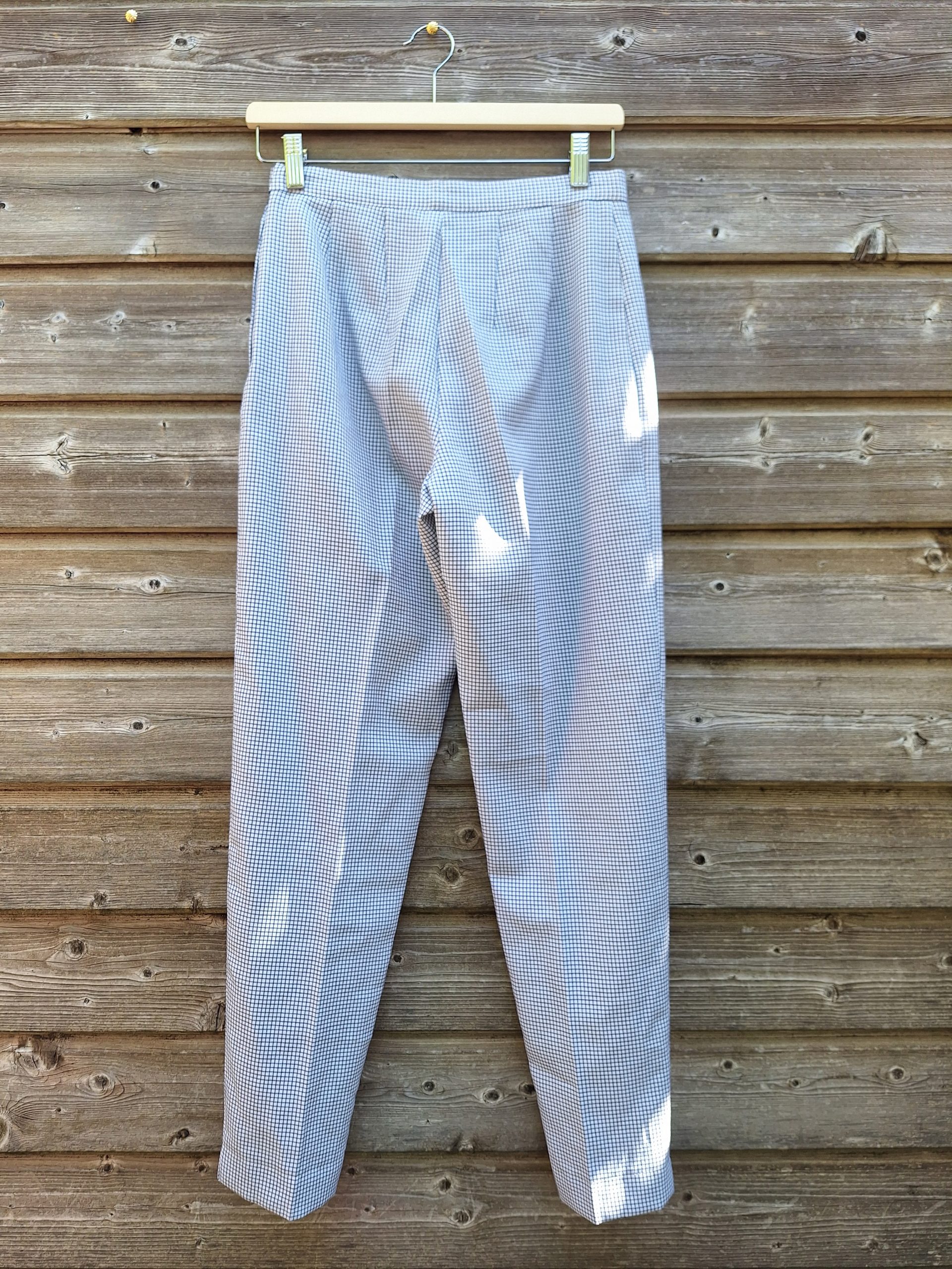 Fermeture et bouton sur le côté, fronces à la ceinture et bas des jambes fendues.